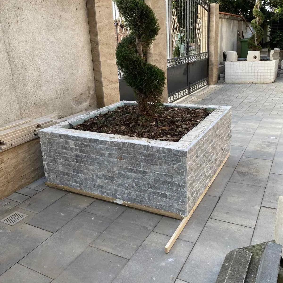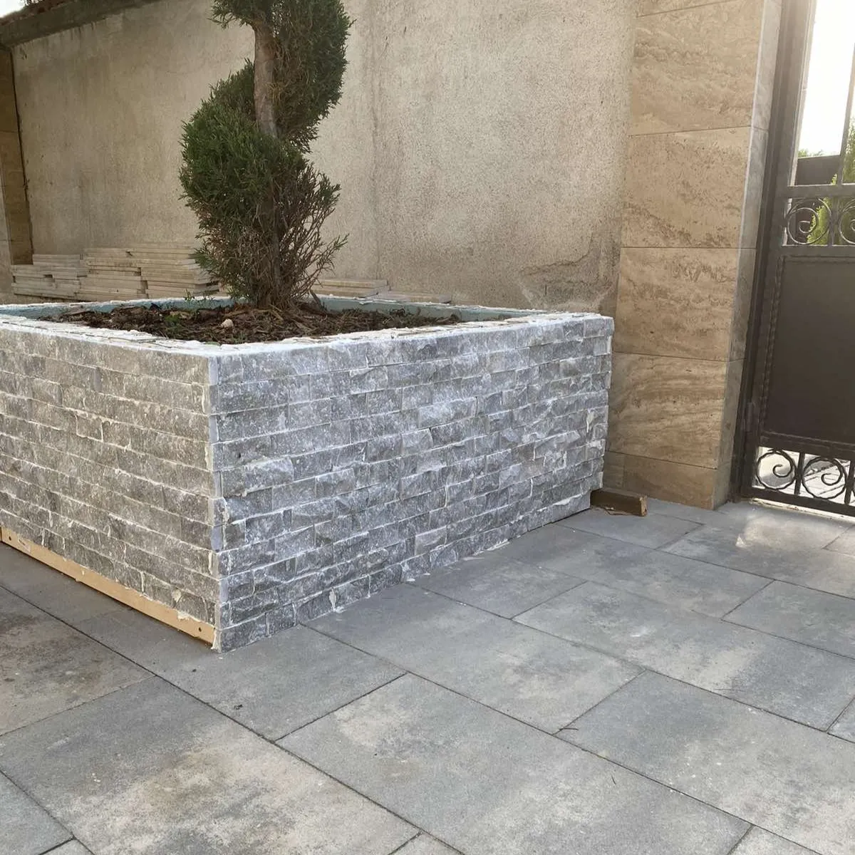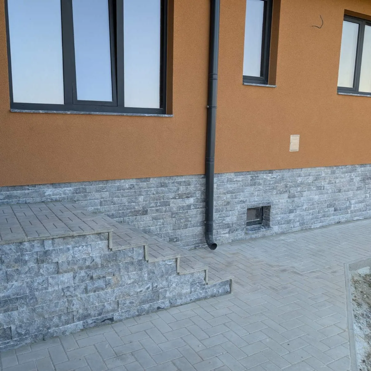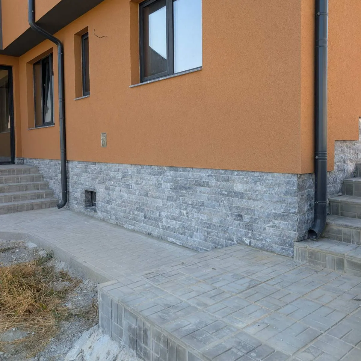 Естествен камък със сив цвят , подходящ облицовки на фасади, огради, цокли, камини и стени.